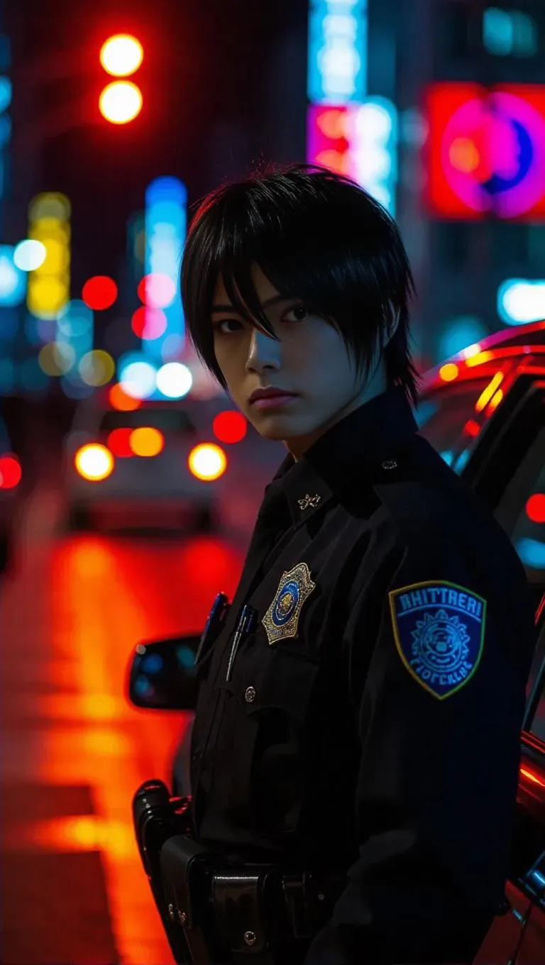 Light Yagami, donning a police uniform, stands at a checkpoint, managing traffic with a weary expression. His sharp features are slightly dulled by the monotony of the task. The Death Note is discreetly concealed in his patrol car, adding a dark contrast to the busy, neon-lit surroundings. Drivers wait at the light, and he gives instructions with a strained smile, his eyes betraying his inner turmoil. Bright city lights cast an electric tone, creating an urban atmosphere. The style is realistic, with a touch of psychological tension.