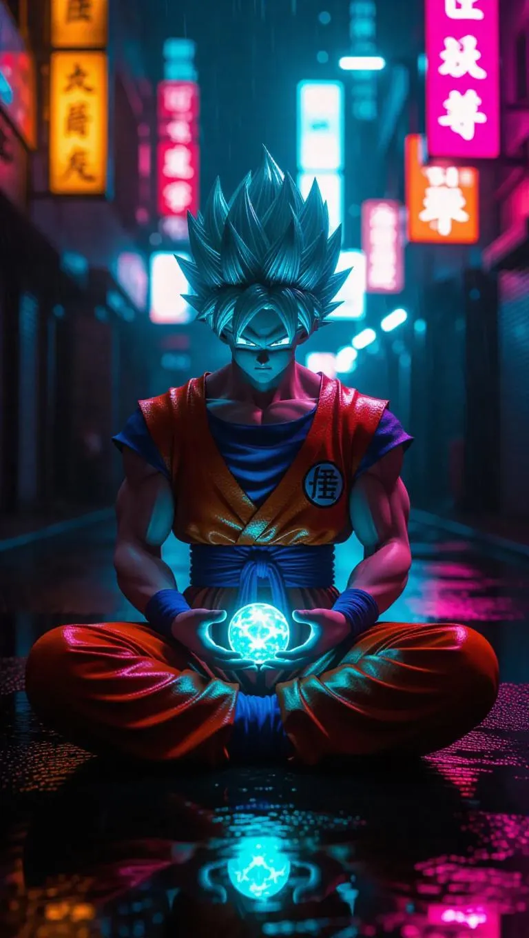 Text to ImageGoku meditates alone in a neon-lit cyberpunk alley, his hair a glowing turquoise. His futuristic suit shimmers as holographic Dragon Balls whirr around him. Bright neon colors clash wildly, creating an exciting and dynamic atmosphere.Recreate