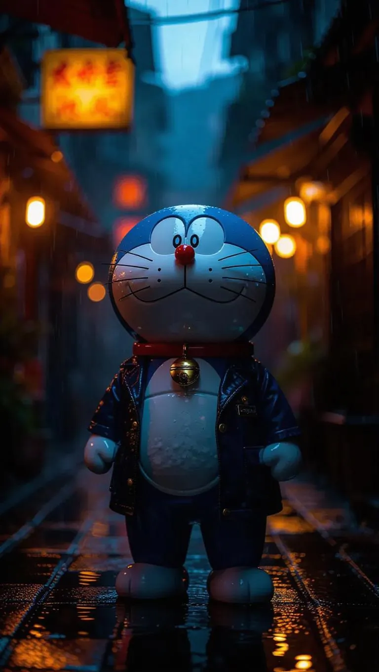 Doraemon, envisioned as a noir gumshoe, stands in a rain-drenched alley of 1975 Rio de Janeiro. He wears a trendy shirt and lightweight jacket, glancing at his wristwatch. His gadget pouch holds odd, glowing trinkets. The twilight lighting casts intricate shadows, enhancing the cinematic feel. Warm light from a distant samba club shimmers, providing a lively contrast to the forlorn alley, amplifying the tension. The scene integrates elements of Brazilian culture with classic noir themes.