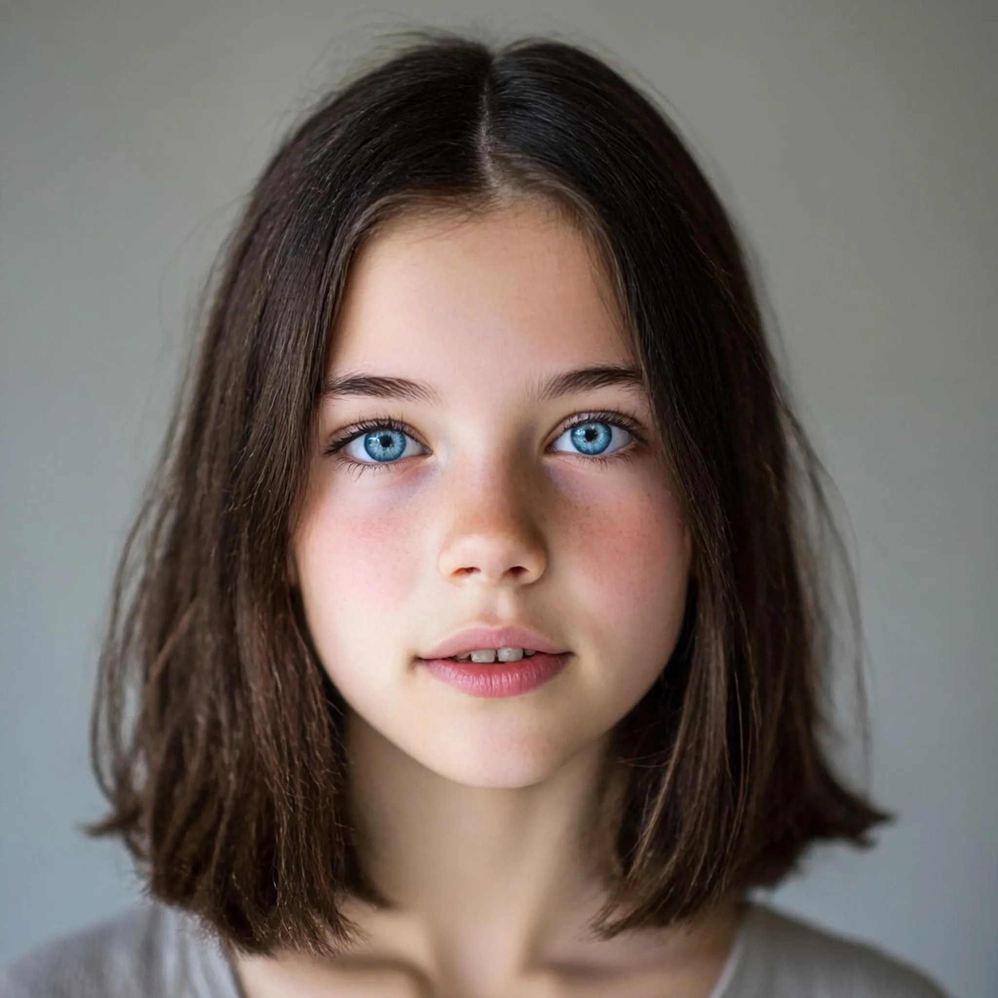 Generate a realistic AI portrait of a 14-year-old European teen girl. Featuring dark brown straight shoulder-length hair, captivating blue eyes, and a slightly parted mouth. Create this detailed, lifelike character image instantly with Vivago.ai's powerful AI image generation tools. Transform your vision into professional-grade visuals.