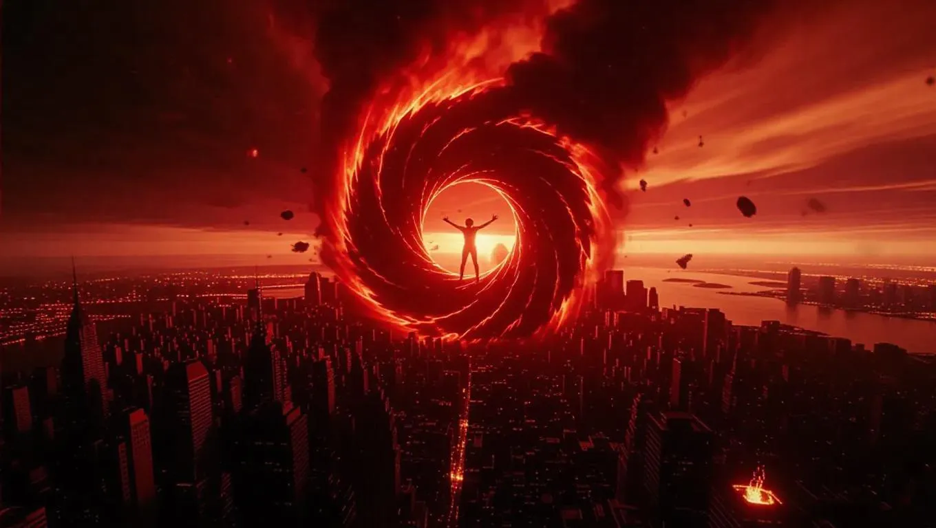 Vivid AI-generated apocalypse scene depicts a swirling singularity of black flames consuming reality. Hyper-saturated crimson and void-black contrasts highlight disintegrating landscapes, reverse-motion debris, and demonic spark mutations. Fisheye perspective curves annihilation into a sphere with radioactive glow, extreme motion blur, and Escher-like gravity warps. Unleash AI creativity for surreal, hyper-detailed destruction visuals.