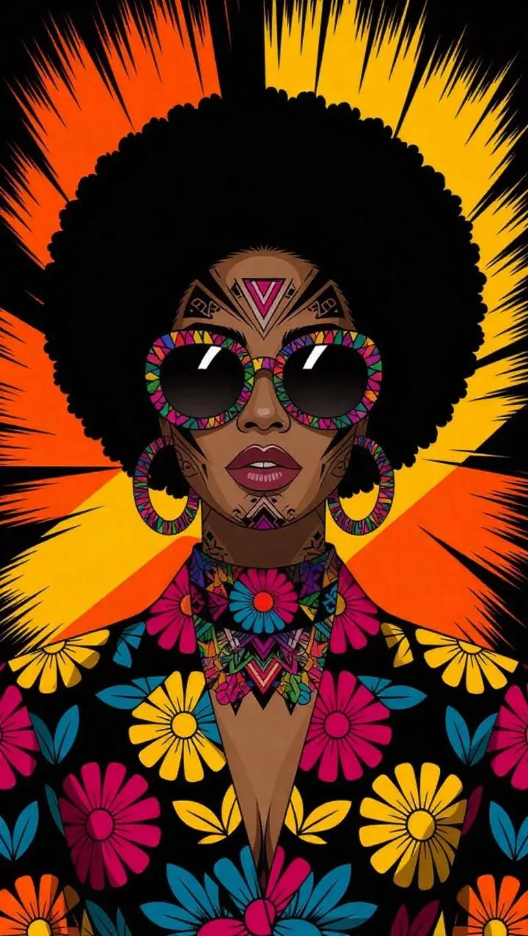 Create bold, vibrant AI art with a stylish woman in afro, sunglasses, and floral patterns. Explore dynamic visuals featuring grungy textures, intricate designs, and vivid orange-yellow-black backgrounds. Perfect for eye-catching illustrations, powered by vivago.ai's AI image generator for striking, colorful creativity.