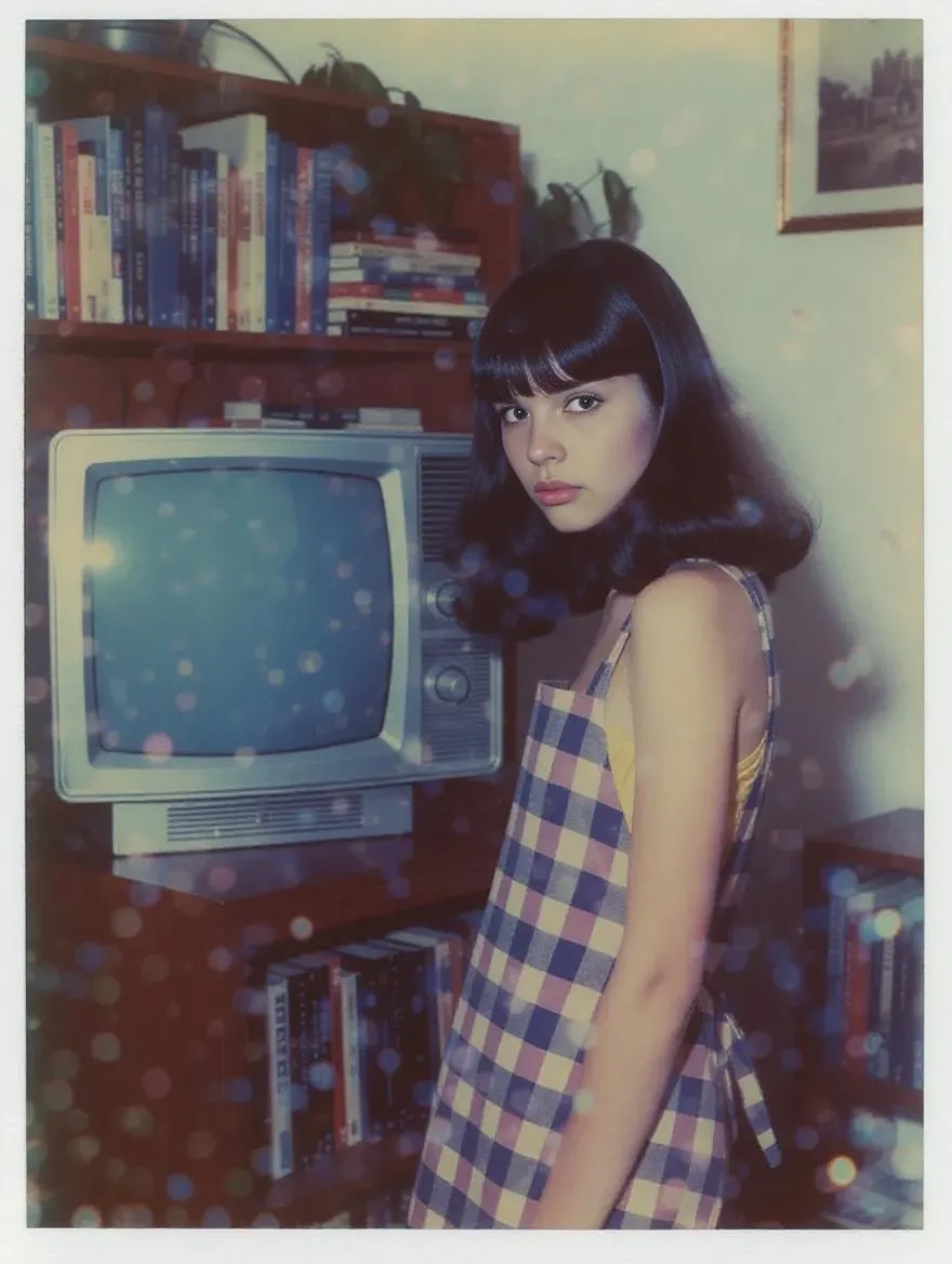 Create AI retro sci-fi scenes at VivaGO. Generate Polaroid-style photos featuring Googie interiors & 70's nostalgia. Craft images with a flirty girl in a naked apron next to a vintage TV, bookshelf, grainy textures, and retro color palettes of silvery white, dark blue, acid yellow & maroon. Professional AI image generation tool.
