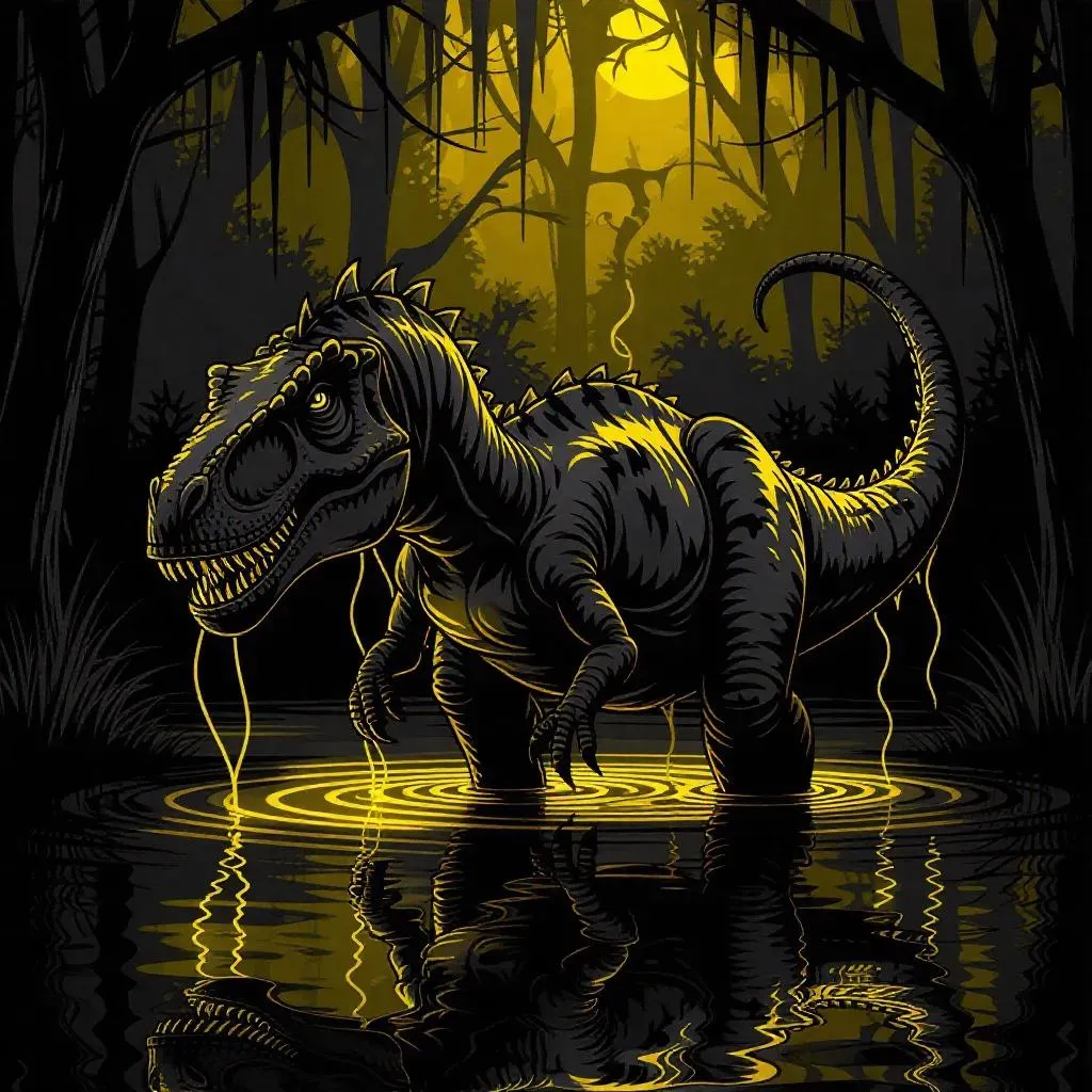 Text to ImageNeon graffiti art style, Alcosaur with a striking gray and yellow color palette, set against a moody swamp background, glowing tendrils of light weaving through the murky waters, creating an otherworldly atmosphere.Recreate