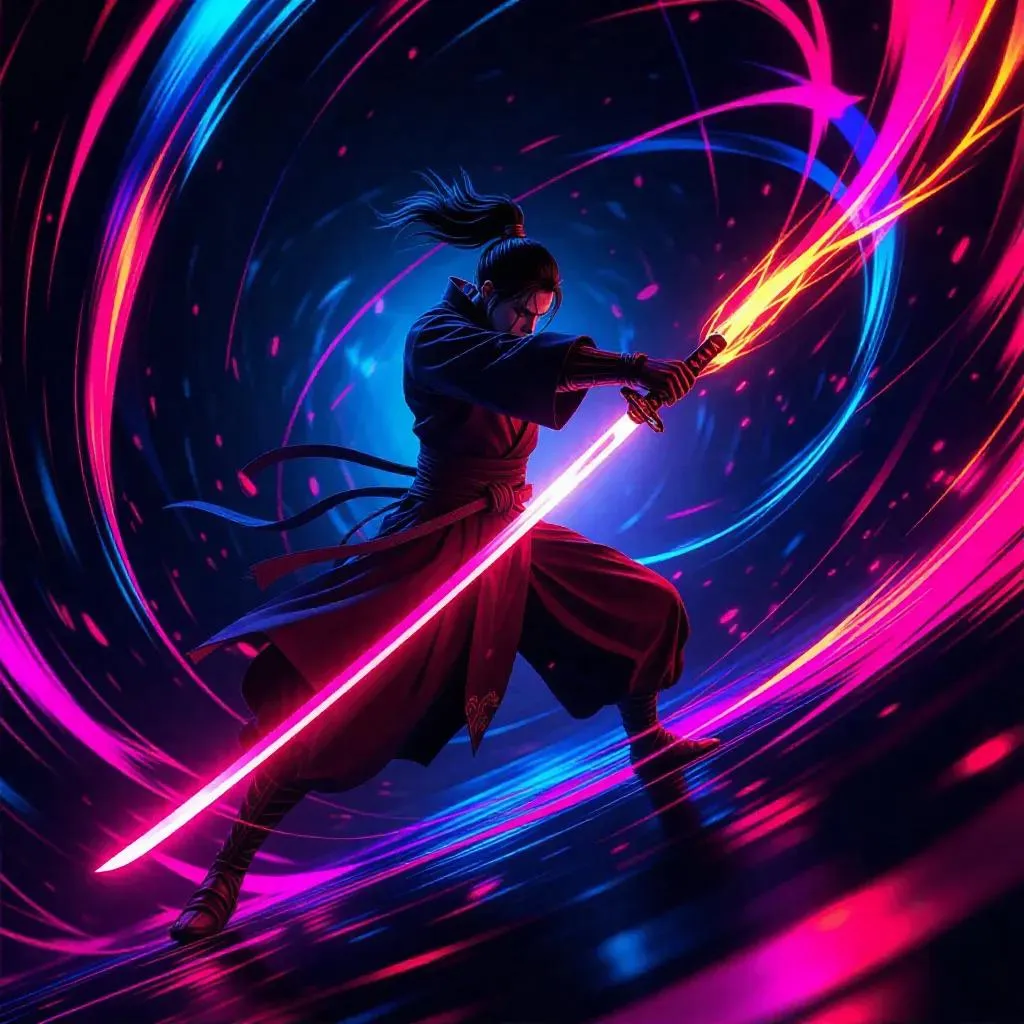 Experience AI-generated fantasy art of a dynamic swordsman wielding a glowing sword that rips reality, unleashing vibrant surreal energy. Anime meets hyper-realistic textures in this high-contrast scene with swirling dimensions. Elevate your creative projects with AI-powered visuals blending motion, intensity, and supernatural detail.