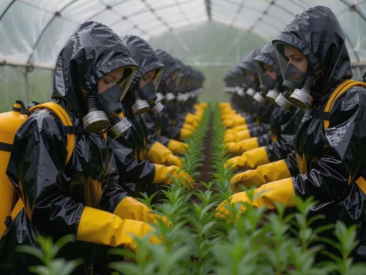A group of ladies work in an experimental tea garden, inside a controlled environment where it is always raining, to protect them the ladies wear maxi-style, tightly belted, hooded shiny PVC macs, with rubber wellingtons, rubber gloves, rubber mask and oxygen tanks strapped on their backs, this way they do not contaminate the tea plants.