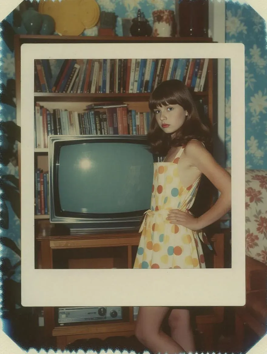 Create AI retro sci-fi scenes at VivaGO. Generate Polaroid-style photos featuring Googie interiors & 70's nostalgia. Craft images with a flirty girl in a naked apron next to a vintage TV, bookshelf, grainy textures, and retro color palettes of silvery white, dark blue, acid yellow & maroon. Professional AI image generation tool.
