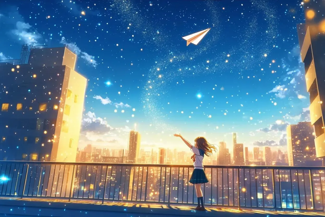 Create vibrant anime-style visuals with AI: sun-drenched city rooftops, stardust snowfall, a schoolgirl reaching into golden light. Cinematic watercolor effects, bokeh glow, and shallow depth of field enhance emotional storytelling. Perfect for anime art, fantasy scenes, and atmospheric imagery. Powered by Vivago.ai's professional AI tools for stunning, delicate compositions.