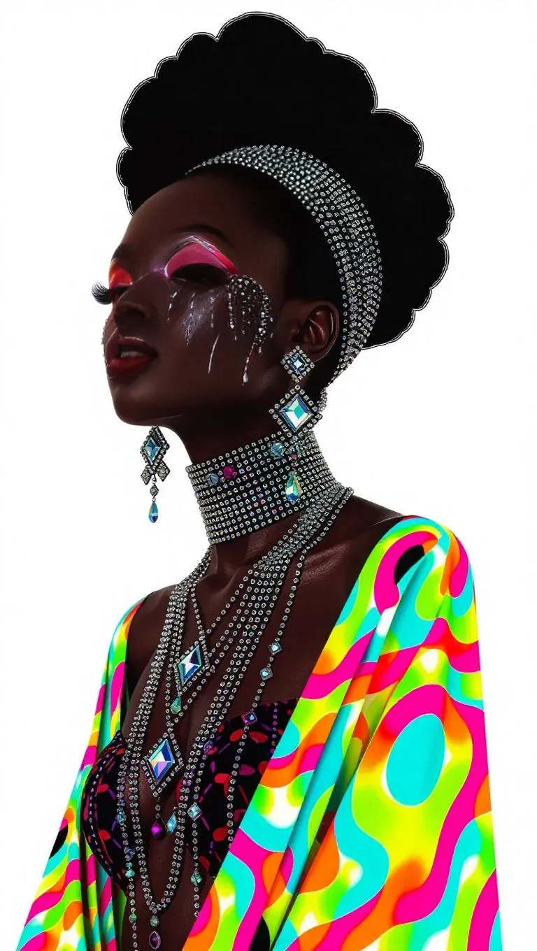 Art deco A beautiful Black American woman with diamond-encrusted skin, draped in vibrant, eclectic attire, embodying agony, pain, and hunger, amidst a surreal psychedelic backdrop, in the unique styles of Tim Burton, Hayao Miyazaki, and Ash Thorp, with mixed media elements, optical illusions, and 2D flat design, on textured paper