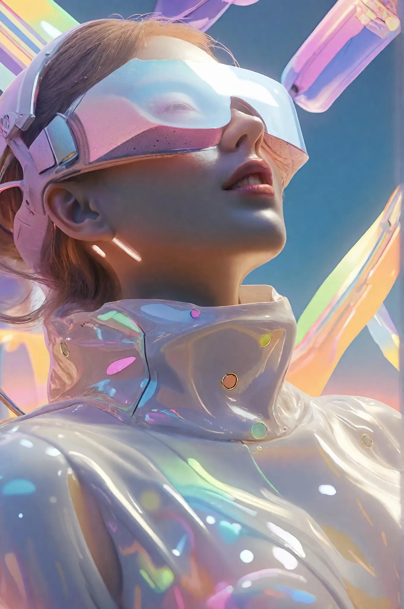 Create vibrant AI-generated images of a bright pastel cyberpunk lab with cartoon designers floating in glowing AI data streams. Featuring cyber glasses, holographic interfaces, rainbow clouds, and geometric particles in a soft-focus 3D render. Macaron color palette evokes a joyful futuristic vibe. Perfect for tech-inspired visuals.
