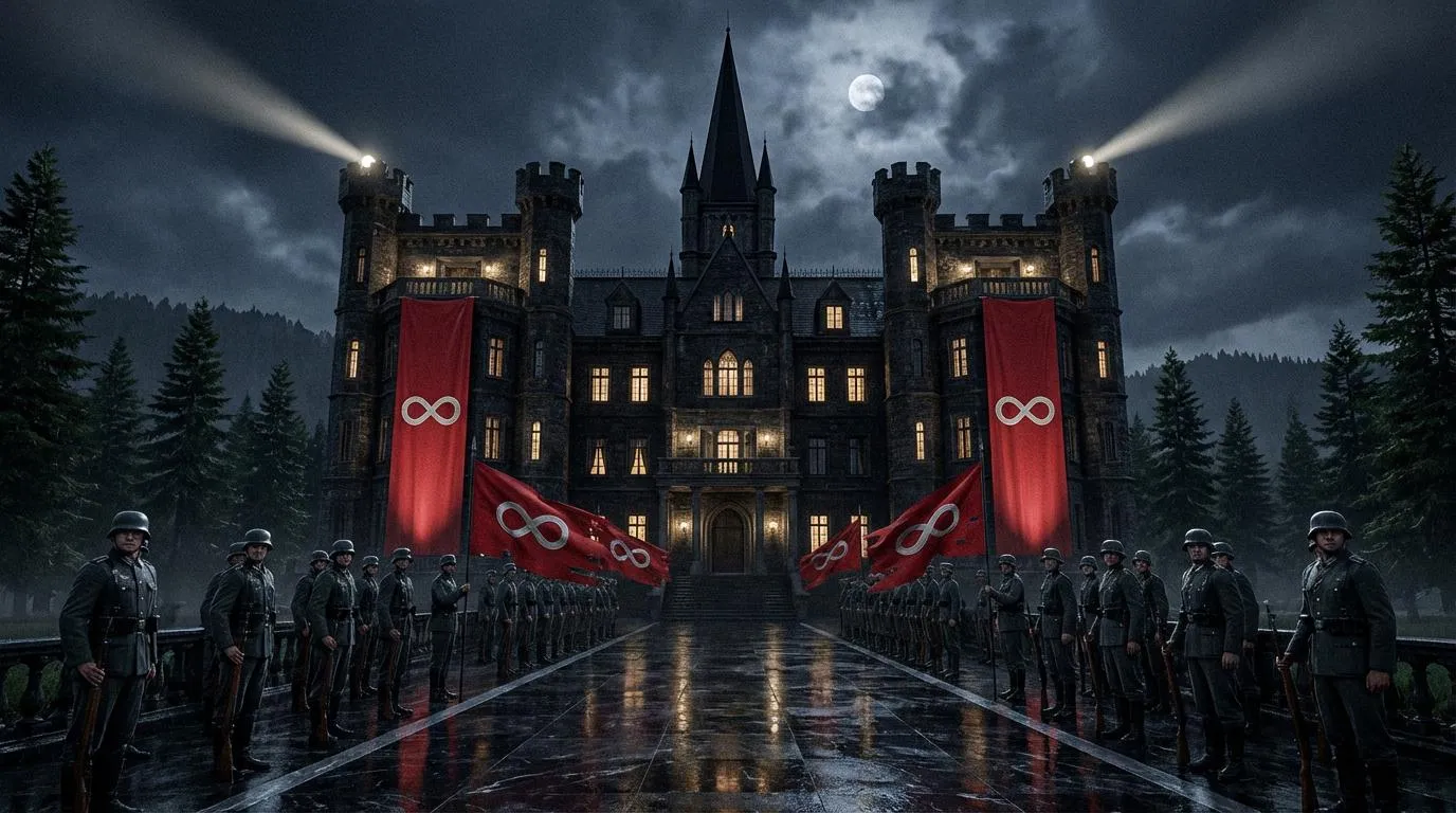 Create stunning AI-generated night scenes of a Gothic infinity mansion with dramatic red canvases, towering black spires, and searchlights. Generate images featuring a company of 1940s German soldiers on wet marble walkways amidst fluttering infinity flags. Design your own haunting, atmospheric visuals with Vivago.ai's powerful image generation tools.