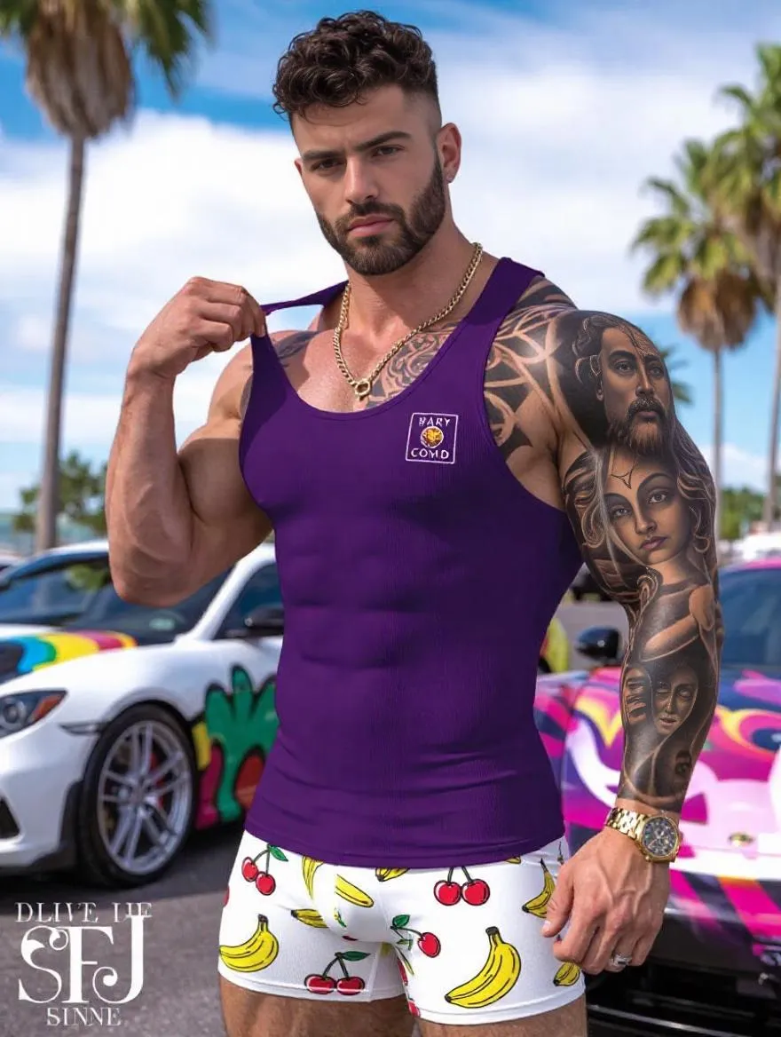 A highly realistic, high-definition portrait of a very handsome, muscular man with fair skin and a full, dark curly hairstyle. He has a well-groomed thick beard and is giving a confident, seductive look with slightly pursed lips. He’s wearing a max tight tank-top in purple with a small chest patch and max tight short-short white shorts with graffiti-style prints including bananas and cherries icons. His right arm is heavily tattooed with intricate, realistic black and grey sleeve art featuring mythological figures and faces. He wears a gold chain and a large luxury watch. He’s standing in a slightly angled pose, pulling up one side of his shorts with his left hand to reveal his muscular thighs. The background is plain and neutral, and the lighting is soft but emphasizes the body definition and clothing texture. Ultra-detailed, fashion-forward, studio photography style