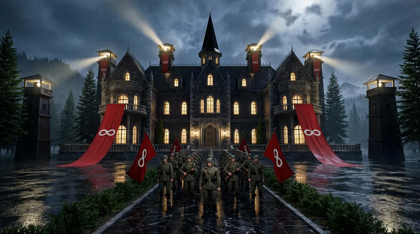 Create stunning AI-generated night scenes of a Gothic infinity mansion with dramatic red canvases, towering black spires, and searchlights. Generate images featuring a company of 1940s German soldiers on wet marble walkways amidst fluttering infinity flags. Design your own haunting, atmospheric visuals with Vivago.ai's powerful image generation tools.