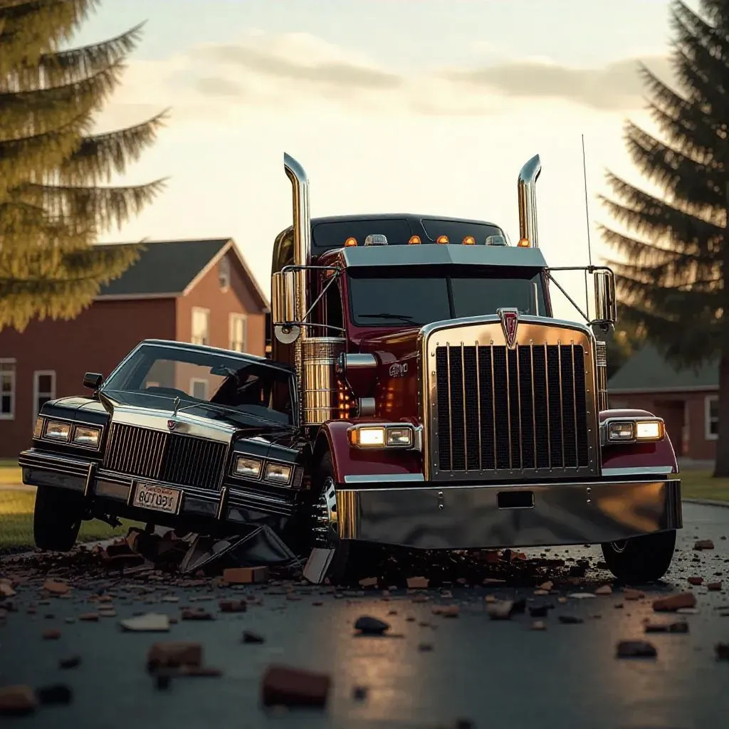 Visualize an explosive 1980s scene: A classic American semi-truck shattering a black Cadillac on school grounds. Featuring a detailed green-eyed youngster in jeans & T-shirt, shiny bob cut. Transform vivid text prompts into stunning AI visuals with VivaGO.ai. Word count: 58