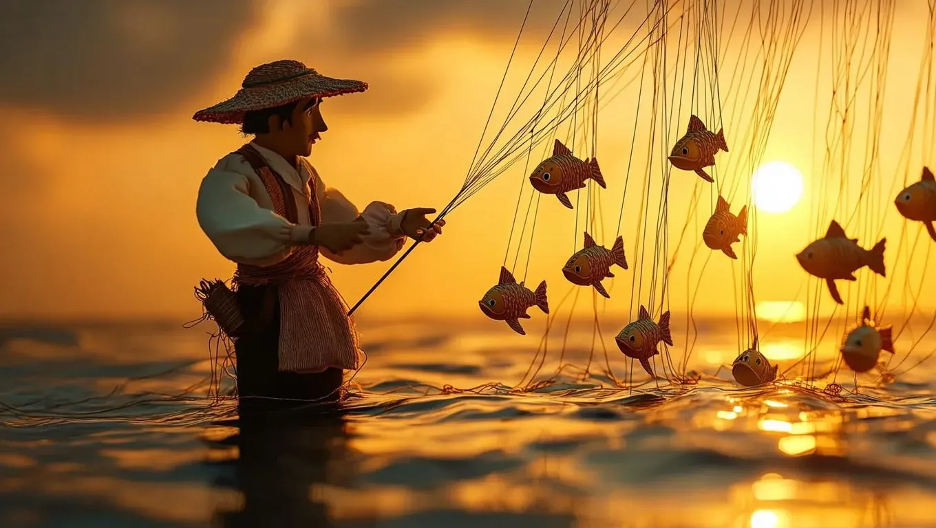 A puppet fisherman, dressed in traditional attire, casts his line into a sea of intricate strings, where miniature puppet fish, each attached to their own tiny strings, swim. The setting sun bathes the scene in warm, golden light, casting shimmering reflections on the strings and water. The light is soft and diffused, enhancing the dreamlike, whimsical atmosphere. The style is realistic with a touch of surrealism, emphasizing the recursive and fantastical nature of the scene.