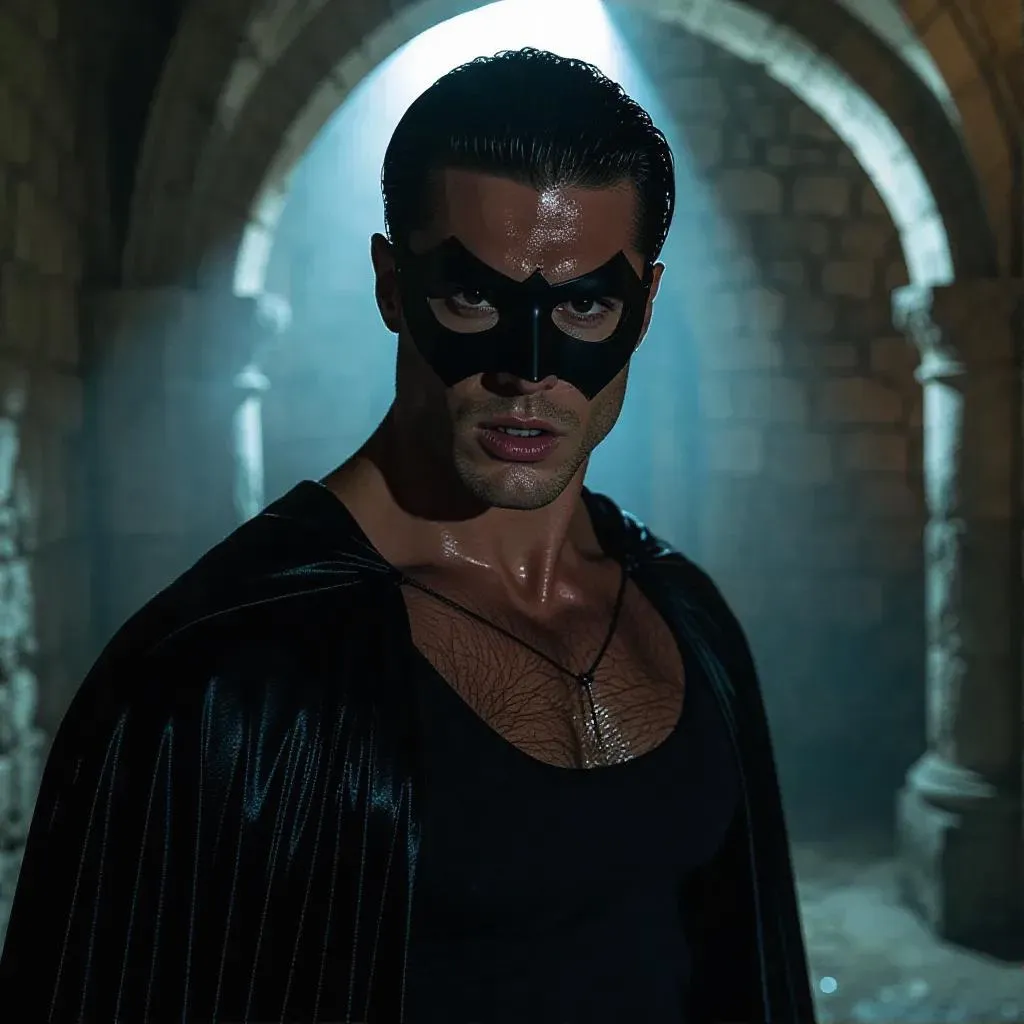 Generate a hyper-realistic 8K vampire portrait with cinematic lighting. Spanish dreamboat hunk wears a Zorro mask, glossy black cape, and soaked tank top. Features predatory smile, visible veins, bite marks, and William Goodge aesthetic. Explore AI image generation at vivago.ai for high-contrast photorealistic art.