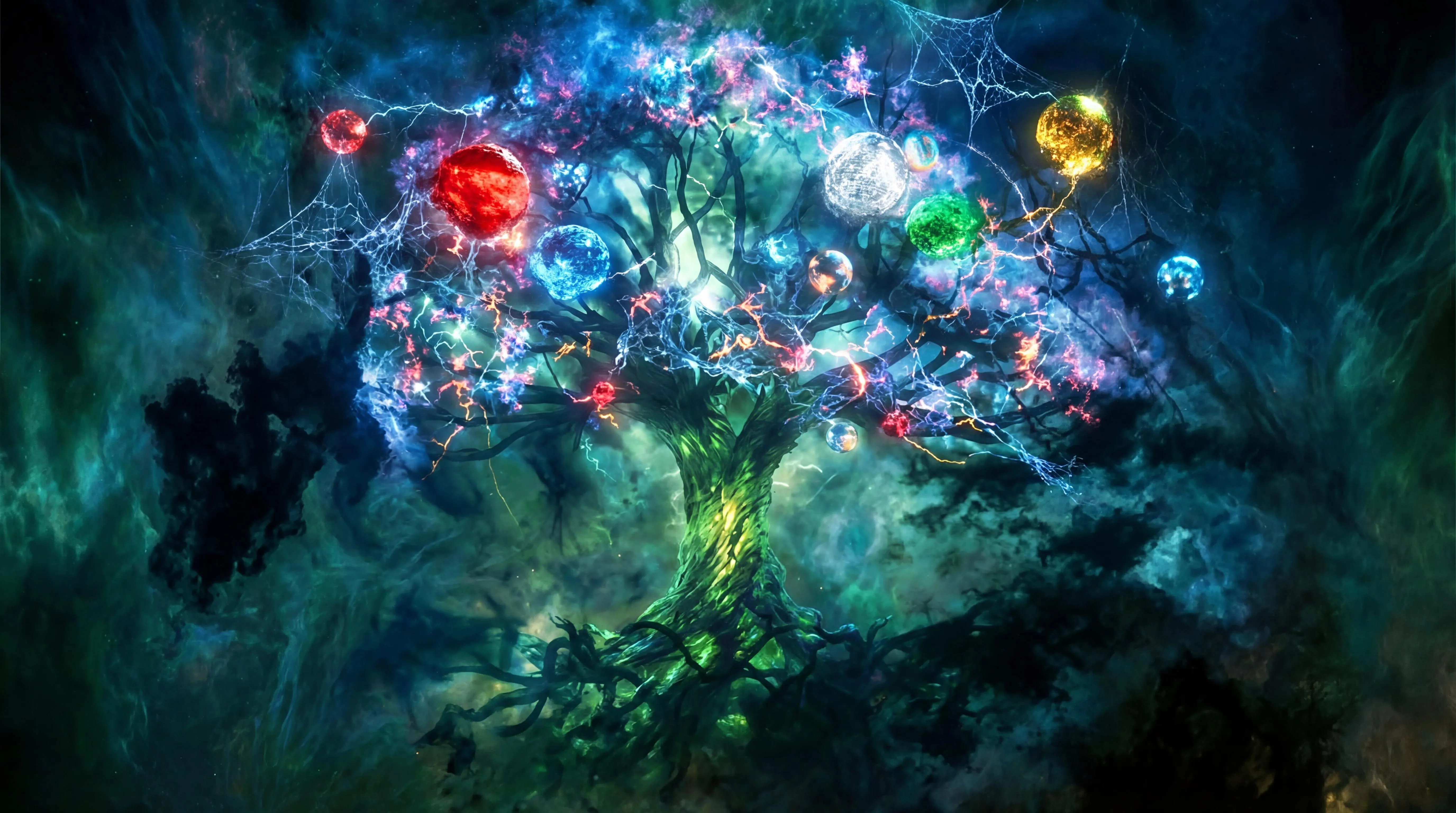 Explore AI-generated visuals merging Marvel, DC, Arrowverse, and Spider-Verse multiverses. See SSU's webs entwine with MCU's branches, Arrowverse's spheres fuse with DCEU's orbs. Create stunning multicolored, web-tree branched dimensional concepts. Generate this iconic cosmic convergence using AI art tools. No people. (47 words)
