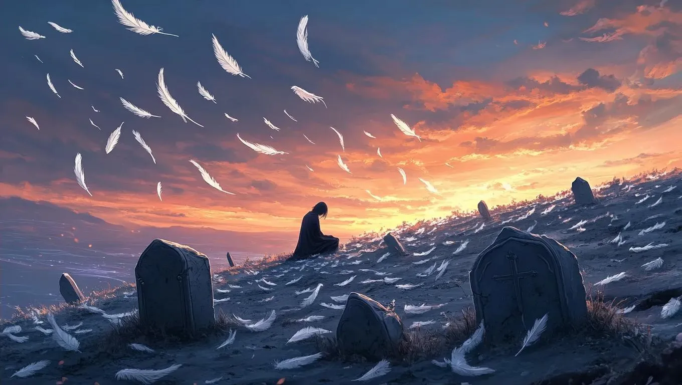 Create AI-generated art of a windswept hill with ash-covered stone graves shaped like broken instruments. Scatter glowing white feathers, translucent music notes, and a lone kneeling figure under twilight skies. Perfect melancholy anime scenes with painterly detail using Vivago.ai's AI image tools for emotional, ethereal storytelling visuals.