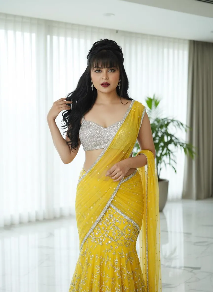 The identity of the uploaded portrait is strictly locked (retaining facial contours, authentic Indian skin tone, hairstyle and age). This is a bust portrait featuring a young Indian woman with a stunning hourglass figure, boasting an elegant waist-to-hip ratio and taut abdominal lines, with her full body curves perfectly accentuated. She has voluminous, big wavy long black curls, and her makeup is exquisitely alluring: smoldering cat eyes paired with pearlescent highlighter, full and dewy red lips, a lazy and captivating gaze, and an expression exuding relaxed yet sensual tension. She is dressed in a yellow beaded saree set: the strapless crop top is fully encrusted with silver micro-diamonds, its tailored fit accentuating her voluptuous bust; the high-waisted bodycon mermaid saree skirt features a bright yellow tulle fabric embellished with silver rhinestones and beadwork, edged with a silver diamond trim, and is paired with a matching sheer tulle shawl draped over her shoulders. The overall look is opulent and brimming with a sensual aura. She stands front-on in a modern light luxury interior space, her body slightly turned to highlight her waist-to-hip curves. One hand gently tousles her hair, while the other rests naturally on her hip, her gaze fixed directly on the camera, radiating intense allure. The background features floor-to-ceiling windows with white semi-sheer curtains, a large green plant placed beside them, and a white marble floor, bathed in soft, bright light. Soft natural light combined with studio fill light is adopted: the key light illuminates the subject’s entire body, enhancing the sparkling luster of the saree’s diamond embellishments and the delicate texture of her skin, creating an atmosphere of lazy luxury infused with intense sensual tension. The style is modern Indian fashion portraiture, with a high-definition, exquisitely detailed frame and bright, vivid colors, focusing on highlighting the subject’s stunning figure, captivating charm and opulent ensemble.