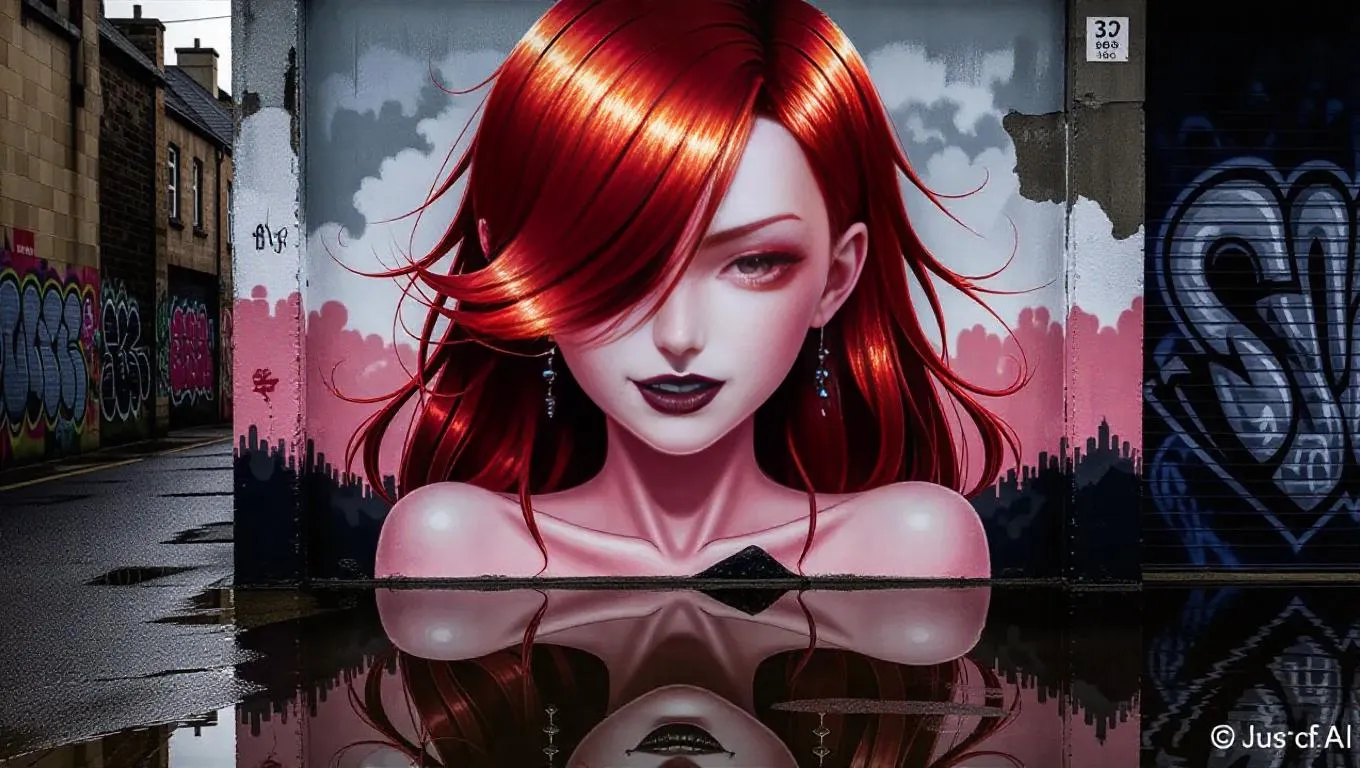 A weathered alley wall features a striking mural of a solitary anime girl with flame-red hair cascading over one eye, her pale skin contrasted by bold black lips and a subtle mole beneath half-lidded eyes. Cinematic lighting highlights her stud earrings and bare shoulders, accentuating her Glasgow smile and sharp fangs as reflective puddles below mirror her solemn expression. Soft greys and blush-pink tones blend into rain-dampened concrete, creating a dreamlike fusion of melancholy and romance through delicate linework and muted realism. The scene balances eerie elegance with nostalgic tenderness, merging urban decay with ethereal character details like chipped nail polish, smudged mascara, and wisps of hair catching unseen breezes.