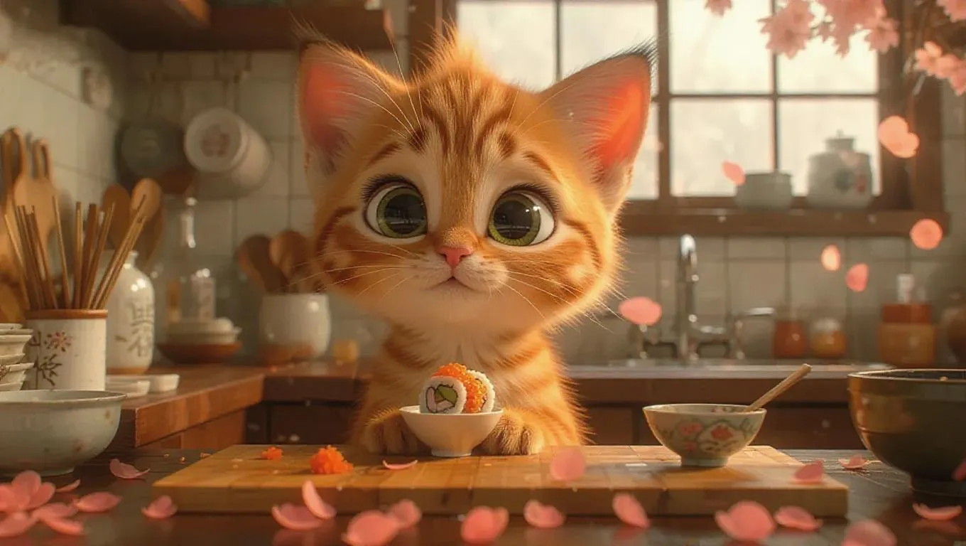 A playful small being from an imaginative world, adorned with a lively, radiant coat and large, sparkling eyes. Located in a quaint kitchen of a suburban sushi joint, rolling sushi and making miso soup. The backdrop includes essential Japanese items: traditional knives, ceramic jars, bamboo utensils, and drifting petals.