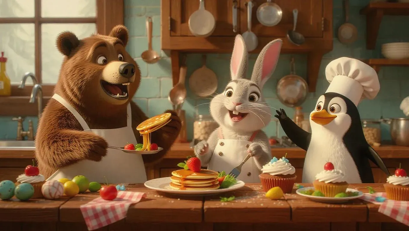 A whimsical kitchen scene featuring a bear, rabbit, and penguin cooking together. The bear skillfully flips pancakes, the rabbit chops vegetables with speed, and the penguin frosts cupcakes. Rustic wooden counters, colorful ingredients, and adorable chef hats. Bright, playful atmosphere with humorous touches like a pancake on the ceiling and the penguin sneaking a bite. Animals exude excitement and concentration.