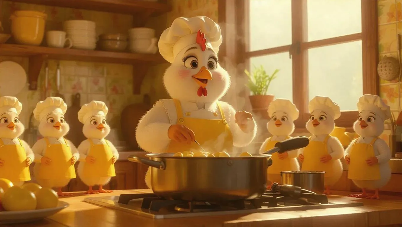 A cartoonish hen in a bright yellow apron and chef hat cooks soup in a steaming pot in a warm, sunlit, tropical kitchen. Many baby hens, also in yellow aprons and chef hats, hold pottery and sit on the kitchen counter, eagerly watching the big hen