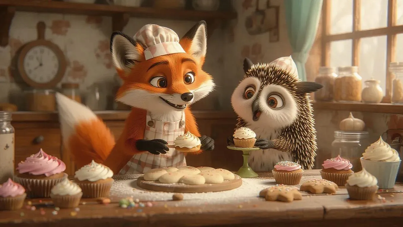 A whimsical bakery scene featuring a fox, hedgehog, and owl baking together. The fox rolls out dough for pastries with enthusiasm, the hedgehog carefully measures flour, and the owl decorates cupcakes with intricately styled icing. Vintage wooden tables, whimsical sprinkles, and adorable baker’s caps. Cozy atmosphere filled with playful touches, like a cookie on the floor and the owl sneaking a taste. Animals exude delight and concentration