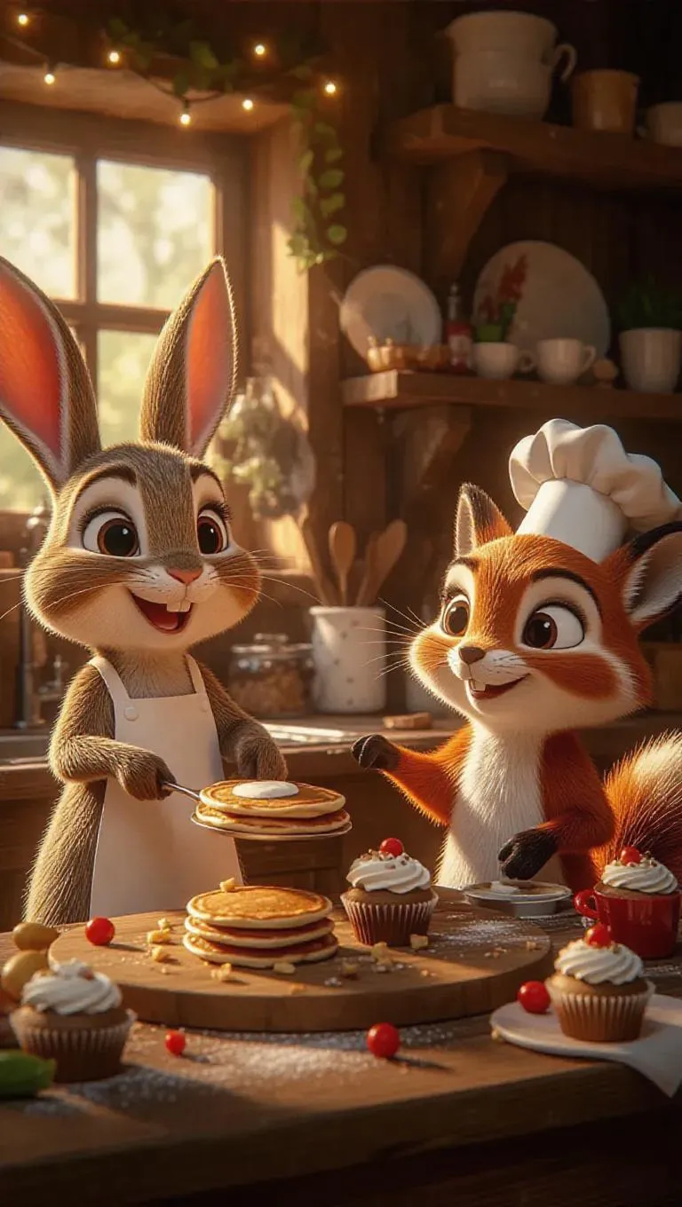 A whimsical kitchen scene featuring a rabbit, fox, and squirrel cooking together. The rabbit skillfully flips pancakes, the fox chops vegetables with agility, and the squirrel frosts cupcakes. Rustic wooden counters, colorful ingredients, and adorable chef hats. Bright, playful atmosphere with humorous touches like a pancake on the ceiling and the squirrel sneaking a bite. Animals show excitement and concentration, surrounded by a sprinkle of fairy lights and a cozy, warm glow.