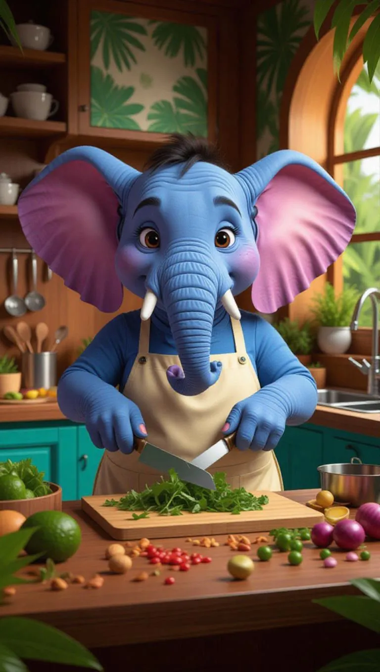 A vibrant cartoon elephant in a beige apron, experimenting with salad-making in a jungle kitchen. The elephant holds a cutting board, chopping vegetables with a serious look. The counter is adorned with various greens, nuts, and spices. The background shows leaf-patterned cabinets, an open window with a jungle view, and cooking utensils. The elephant’s large ears flap as it cooks.