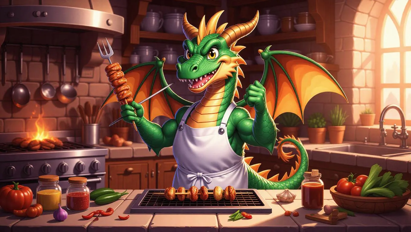 A lively cartoon dragon in a silver apron, grilling skewers in a fantasy kitchen. The dragon holds a barbecue fork, flipping meat with a confident grin. The counter is filled with spices, vegetables, and marinade. The background features stone cabinets, a fire pit, and dragon-themed tools. The dragon’s wings flutter as it roasts.