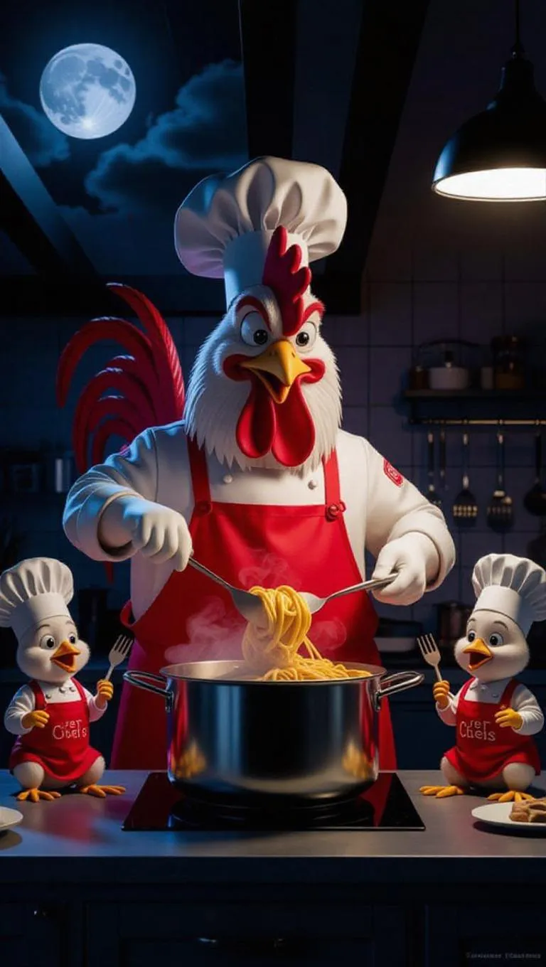 The cartoonish rooster in a bright red apron and chef hat stirs the steaming pot of pasta, his movements energetic and confident. The baby roosters, also dressed in red aprons and chef hats, sit on the kitchen counter, holding sporks. They watch with wide-eyed excitement as the big rooster cooks. The cool, moonlit urban kitchen adds a modern ambiance, with the moonlight filtering in through the skylight, casting long shadows. The camera pans from the big rooster to the baby roosters, capturing their playful reactions.