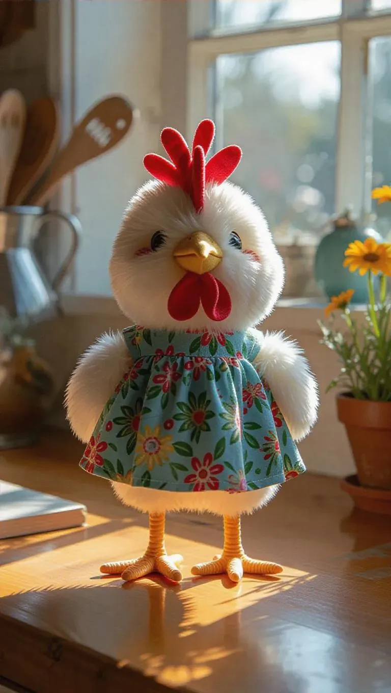 A fluffy, cute hen in a Jellycat style, wearing a vibrant dress, stands confidently as it crows. The hen's soft and warm feathers, with curious and lively eyes, shine in the cozy country kitchen. Sunlight streams through the window, casting a warm, natural glow that illuminates every corner, creating a serene and harmonious atmosphere. Style: Adorable realism.