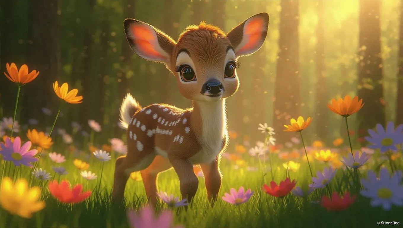 A fluffy, Jellycat-style little fawn stands in a meadow filled with blooming flowers, playfully prancing around and sniffing the blossoms. Its large, bright eyes are wide with curiosity, and its soft, tawny fur glows in the afternoon sun. The fawn's ears flop playfully, adding to its adorable charm. The meadow around it is illuminated with vibrant, colorful light, creating a lively and joyful atmosphere. The scene is rendered in a bright, cheerful color palette, enhancing the overall liveliness and innocence of the fawn.
