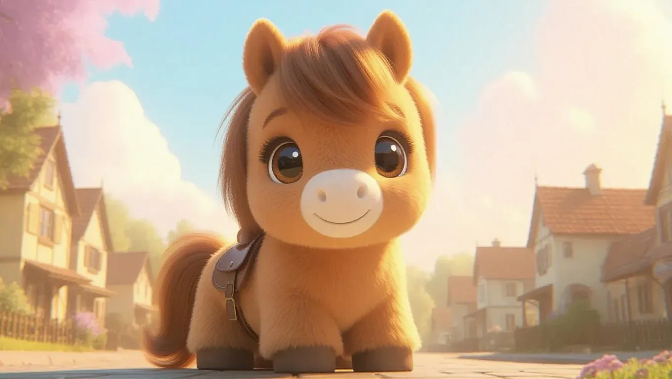 A fluffy, Jellycat-style horse with soft, rounded edges and large, expressive eyes. Its body is covered in plush, chestnut fur, with flowing mane and a tiny, adorable saddle on top. Parked in a cozy, pastel-colored town, under a bright sky. Soft, warm sunlight filters through, casting gentle shadows and highlighting the horse's cuddly texture. The scene exudes a playful, whimsical charm, perfect for a children's storybook.