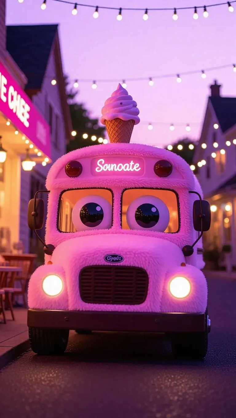 A fluffy, Jellycat-style school bus with soft, rounded edges and large, expressive eyes is parked in front of a bright, cheerful ice cream shop in a charming town. Its body is covered in plush, pink fur, with chocolate brown paws and a cute ice cream cone on top. The sky is a soft lavender at dusk, with fairy lights twinkling in the background, casting a cozy glow that highlights the bus's playful nature. The scene exudes a delightful, indulgent charm, perfect for a children's dessert story.
