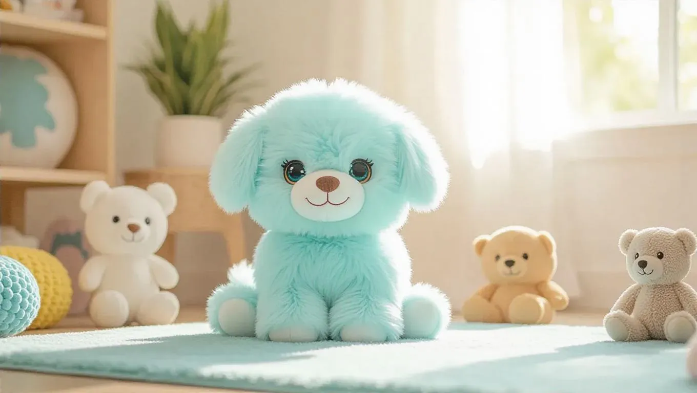 A fluffy, Jellycat-style puppy with soft, mint-colored fur and bright, loving eyes. The puppy is sitting on a rug in a cozy, sunlit room, wagging its tail. Plush toys are nearby, and a light blue rug adds vibrancy to the scene. Soft, warm light filters through the window, casting gentle shadows and highlighting the puppy’s fluffy texture. The scene is heartwarming and inviting, perfect for a children’s book illustration.