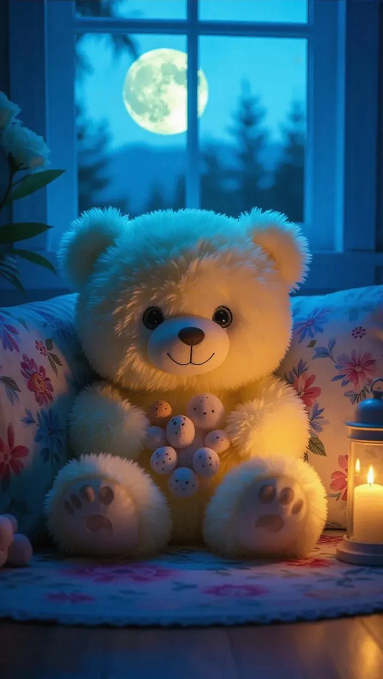 A fluffy, Jellycat-style bear with soft, pastel yellow fur and big, expressive eyes. The bear is curled up in a ball, in a cozy, moonlit room. Plush toys are arranged neatly, and a floral rug adds a whimsical touch to the scene. Soft, cool light filters through the window, casting soft shadows and showcasing the bear’s fluffy form. The scene is dreamy and inviting, suitable for a children’s book illustration.