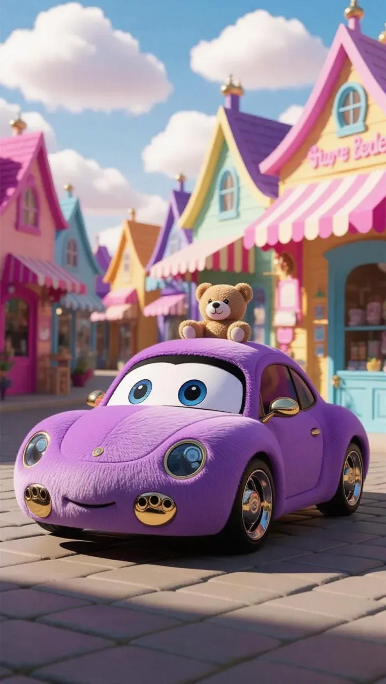 A sleek, Jellycat-style luxury car with soft, rounded edges and large, expressive eyes is parked outside a whimsical toy store in a vibrant, rainbow-colored town. Its body is covered in plush, lavender fur, with gold paws and a tiny, adorable teddy bear on top. The bright sky above is scattered with fluffy clouds, and soft sunlight streams down, creating gentle shadows that highlight the car's cuddly texture. The scene embodies a playful, fantastical charm, perfect for a children's storybook.