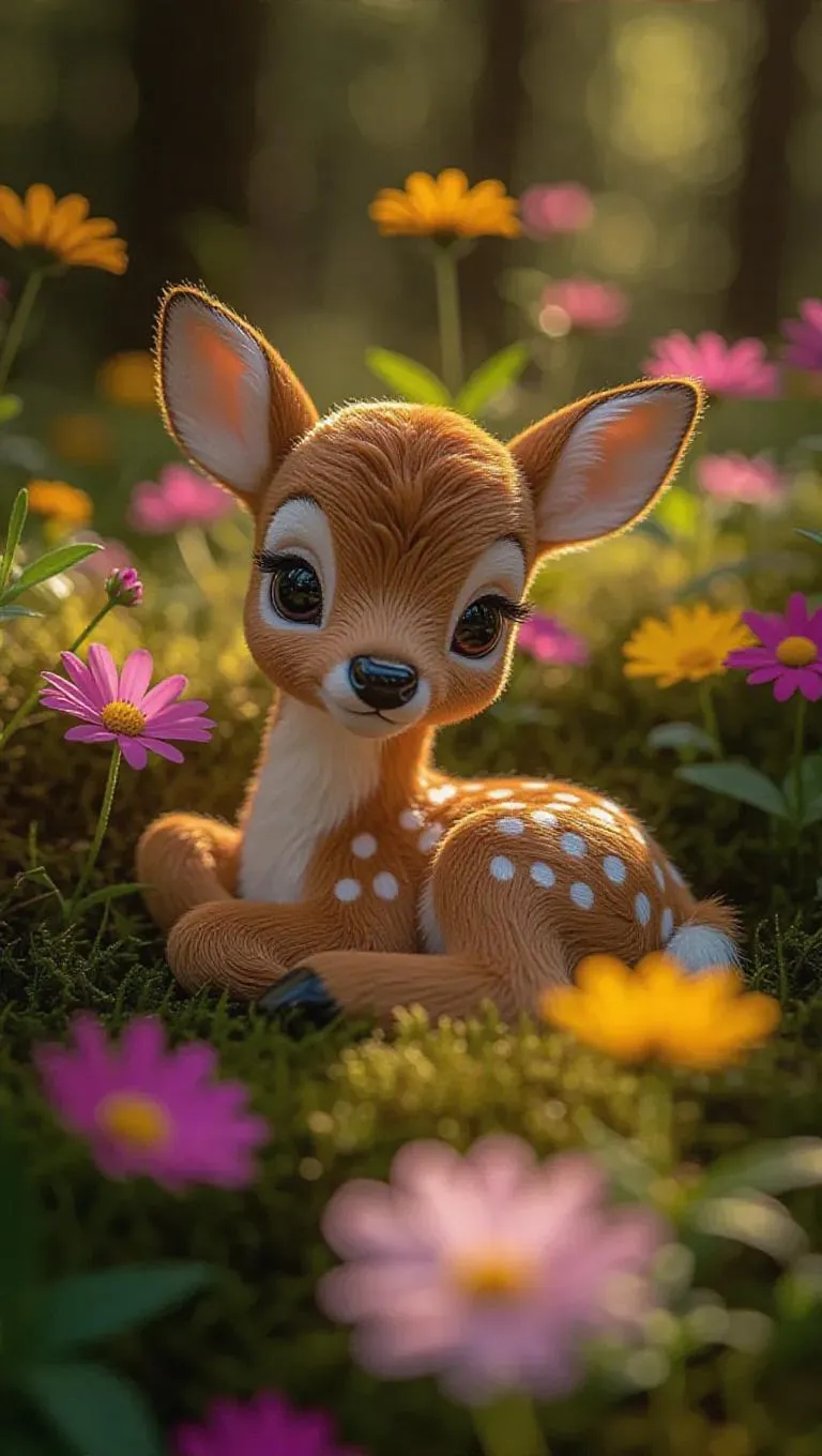 A fluffy, Jellycat-style little deer lies curled up in a soft patch of moss in a lush meadow. Its large, expressive eyes are wide open, and its soft, brown fur glistens in the bright daylight. The deer's delicate spots are just beginning to appear, adding to its endearing charm. The meadow around it is filled with colorful wildflowers, creating a lively and cheerful atmosphere. The scene is rendered in a bold, vibrant color palette, enhancing the overall cuteness and innocence of the deer.