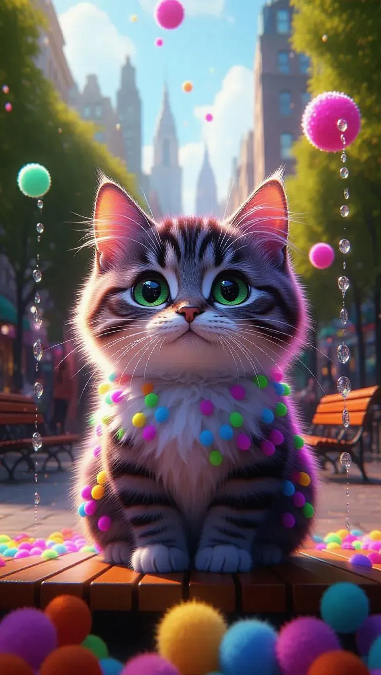 A cuddly, oversized cat with sparkling eyes and a mischievous smile, enveloped in a cloud of colorful bursts, creating a vibrant, energetic atmosphere. The backdrop features a soft, oversized city park with cotton-candy-like fountains and fluffy, oversized benches. The style is inspired by graphic design, with sleek lines and bright colors.