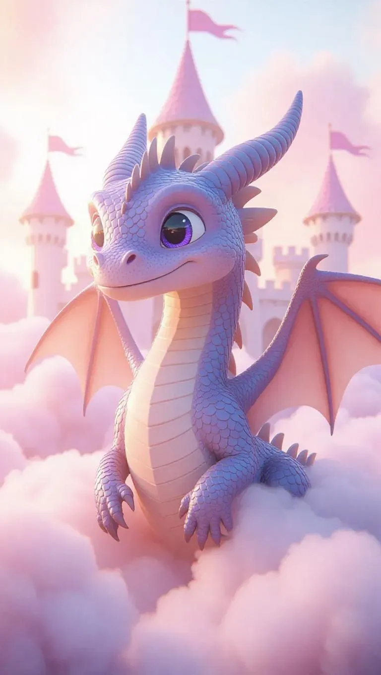 A gentle, oversized dragon with sparkling eyes and a serene smile, surrounded by a haze of cotton-candy-like clouds, crafting a mystical, dreamy environment. The backdrop features a soft, gigantic castle with cotton-candy-like domes and fluffy, giant flags. The aesthetic resembles a whimsical illustration from a children's book, filled with imaginative details and a light-hearted feel.