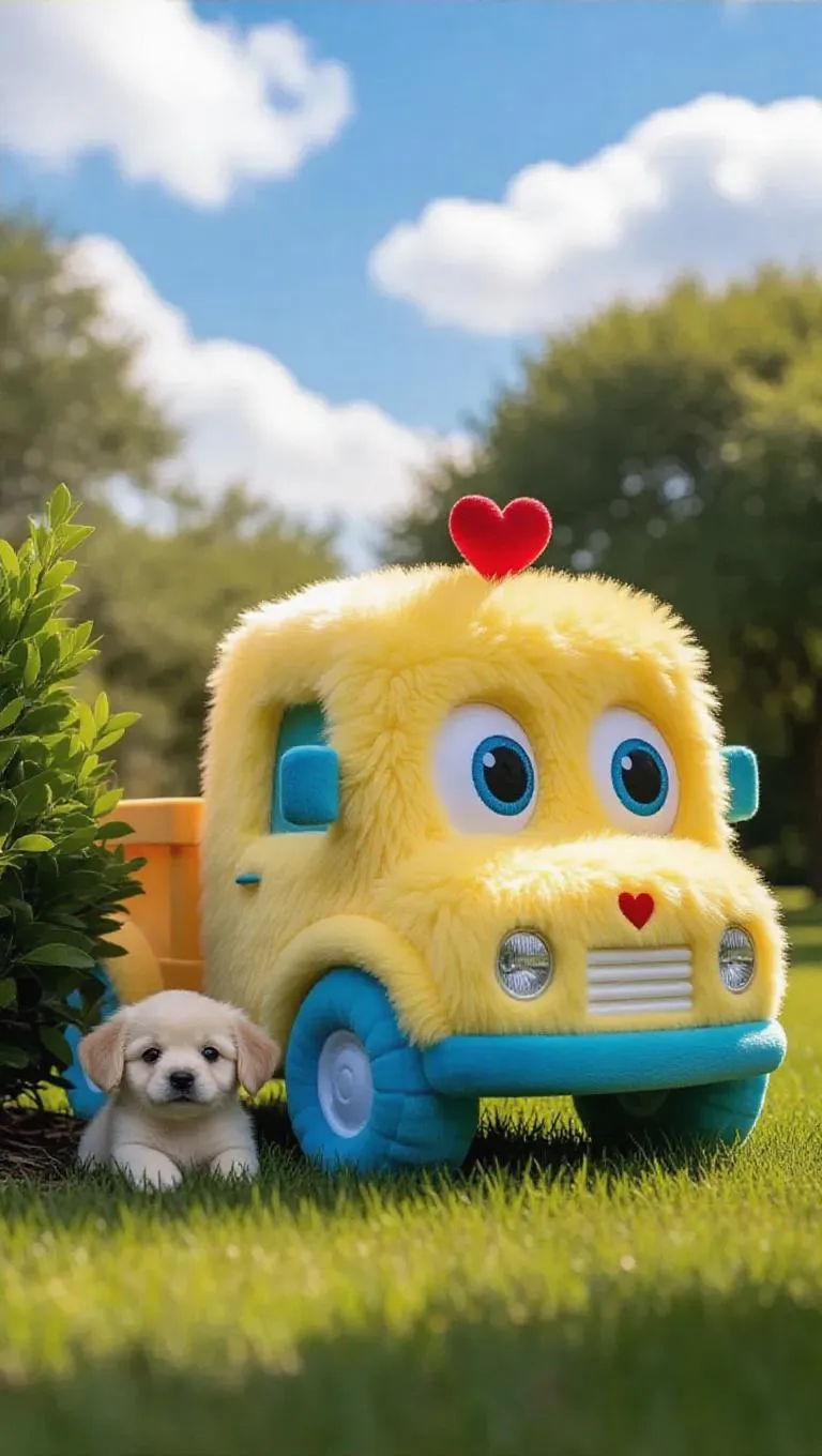 A fluffy, Jellycat-style truck with soft, rounded edges and large, expressive eyes is parked in a sunny, vibrant park, rescuing a tiny puppy from a low bush. Its body is covered in plush, yellow fur, with blue paws and a tiny, adorable heart on top. The clear green sky above is dotted with fluffy clouds, and soft, warm sunlight filters through, casting gentle shadows and highlighting the truck's cuddly texture. The scene exudes a joyful, cheerful charm, perfect for a children's storybook.