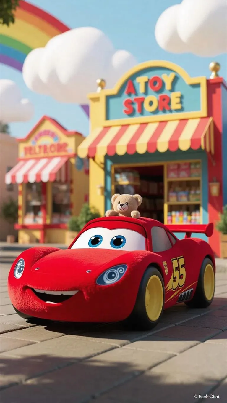 A sleek, Jellycat-style race car with soft, rounded edges and large, expressive eyes is parked in front of a colorful toy store in a cheerful, bustling town. Its body is covered in plush, vibrant red fur, with yellow paws and a tiny, adorable teddy bear on top. The bright sky is painted with a rainbow and fluffy, white clouds, while soft, warm sunlight bathes the scene, casting gentle shadows and enhancing the car's cuddly texture. The scene exudes a playful, festive charm, perfect for a children's storybook.