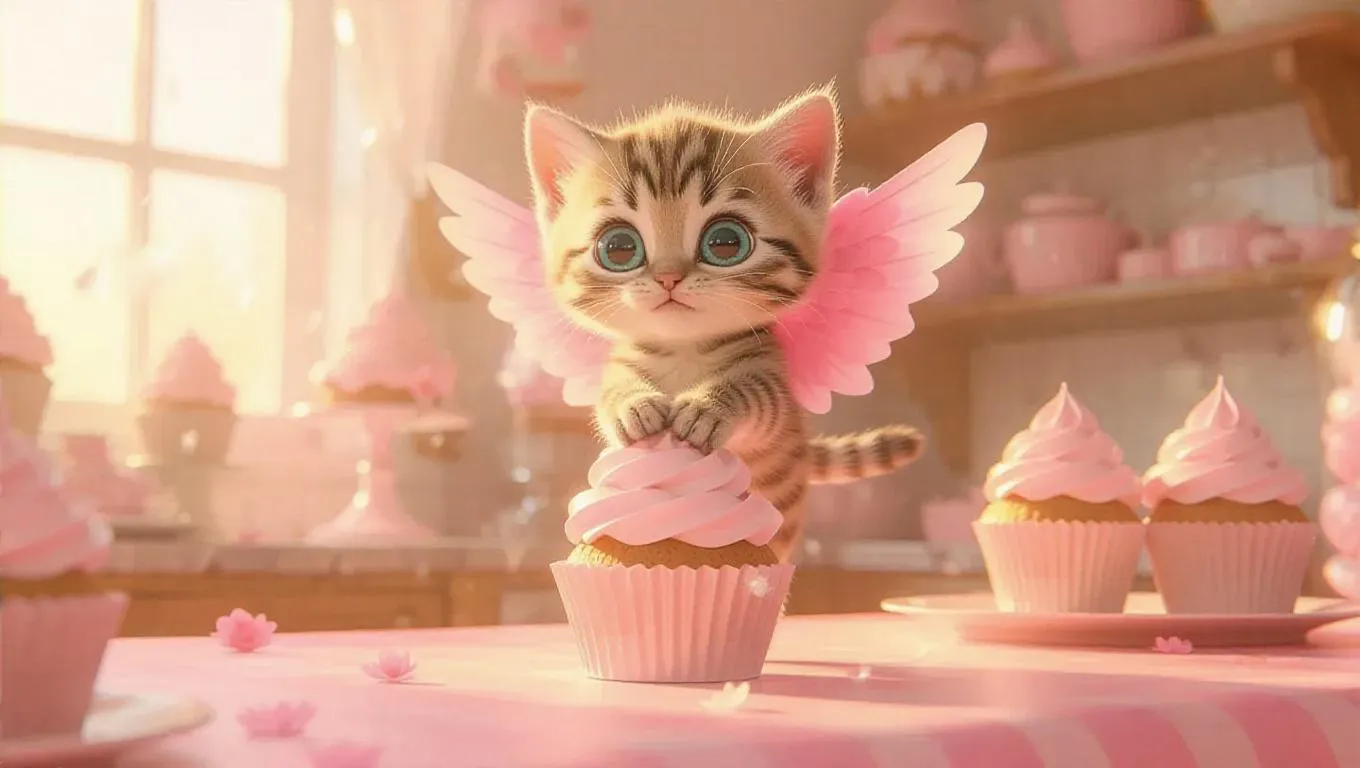 A little kitten with pink wings on its back clings to the end of a cupcake. The little kitten wiggles its wings, floats up, and slowly hovers. The scene is set in a cozy bakery with sweet aromas and pastel decorations, creating a delightful and scrumptious atmosphere. The style is inspired by storybook illustrations, with charming details and friendly characters.