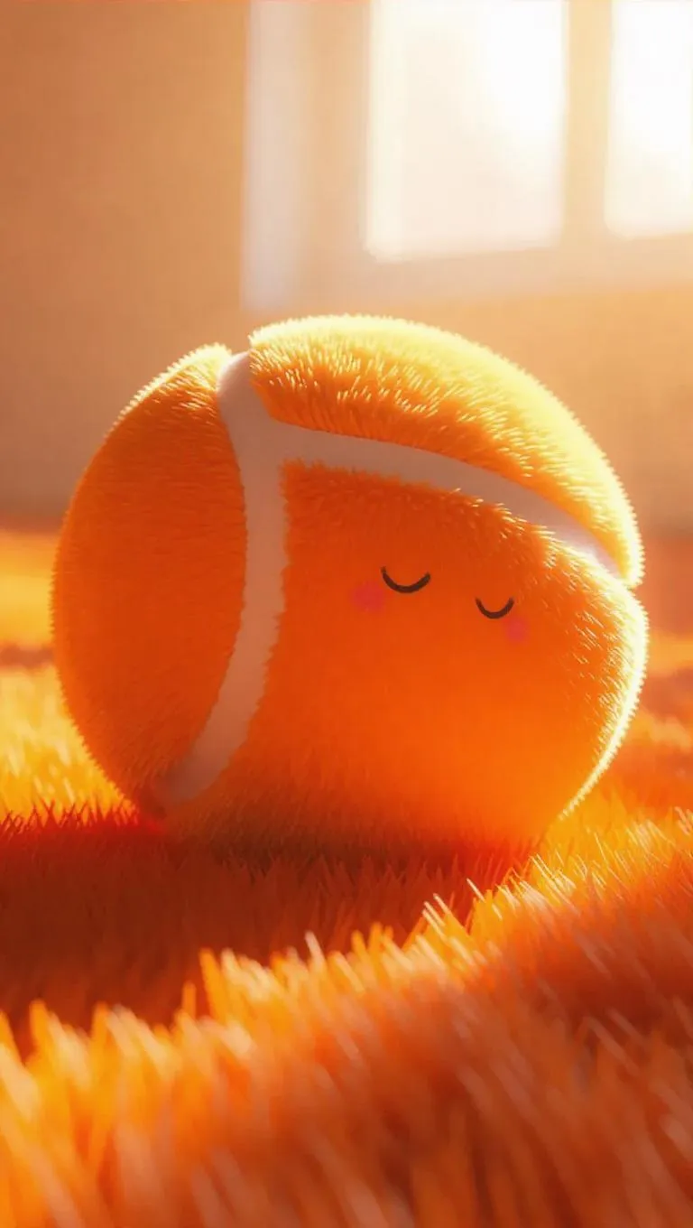 A whimsical depiction of a tennis ball in Jellycat style, where the ball is rendered as a giant, fluffy sphere of soft, orange fur. The seams are depicted as plush, velvety lines, and the surface is soft and dreamy. The entire scene is bathed in radiant, soft light, creating a bright and cheerful atmosphere. The style is playful and cuddly, perfect for a children's book or a cozy home decor piece.