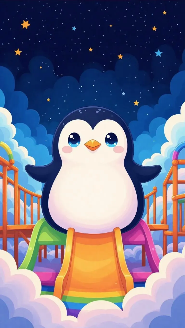 A soft, oversized penguin with sparkling eyes and a gentle smile, surrounded by a cloud of starry night sky, creating a dreamy, whimsical atmosphere. The scene is set in a fluffy, oversized playground with rainbow-colored slides and swings. The style is reminiscent of a children's storybook illustration, with whimsical details and a playful tone.