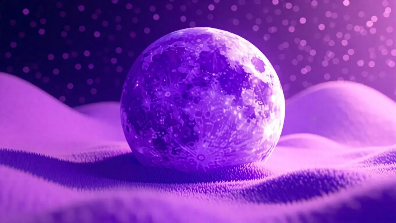 A whimsical depiction of the Moon in Jellycat style, where the lunar surface is rendered as a giant, fluffy ball of soft, lavender fur. Craters are depicted as adorable soft spots, and the shadows are gentle and velvety. The entire scene is bathed in soft, twilight light, creating a tranquil and serene atmosphere. The style is playful and cuddly, perfect for a children's book or a cozy home decor piece.
