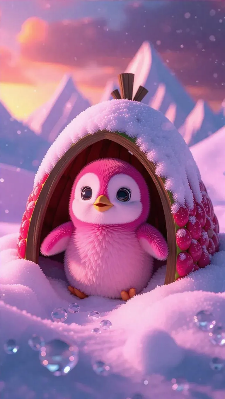 A 3D-cartoon-style charming bubblegum-pink penguin hatchling emerges from a hut-like nest made of frosted watermelon ice crystals. Dawn paints the Antarctic sky in blush hues, casting long navy shadows across glaciers embedded with crushed opal deposits. The chick's fluffy plumage shifts from blush to flamingo tones as it waddles through snowdrifts sparkling with golden diamond dust, each step activating