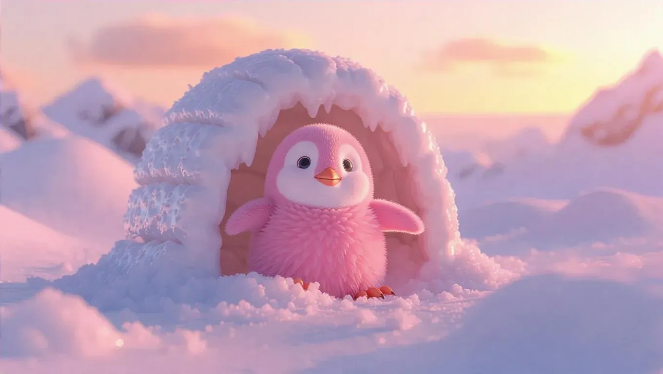 A 3D-cartoon-style playful bubblegum-pink penguin hatchling emerges from an igloo-shaped nest sculpted from frosted vanilla ice crystals. Dawn paints the Antarctic sky in cream hues, casting long peach shadows across glaciers embedded with crushed topaz deposits. The chick's fluffy plumage shifts from blush to butter tones as it waddles through snowdrifts shimmering with dark diamond dust, each step activating